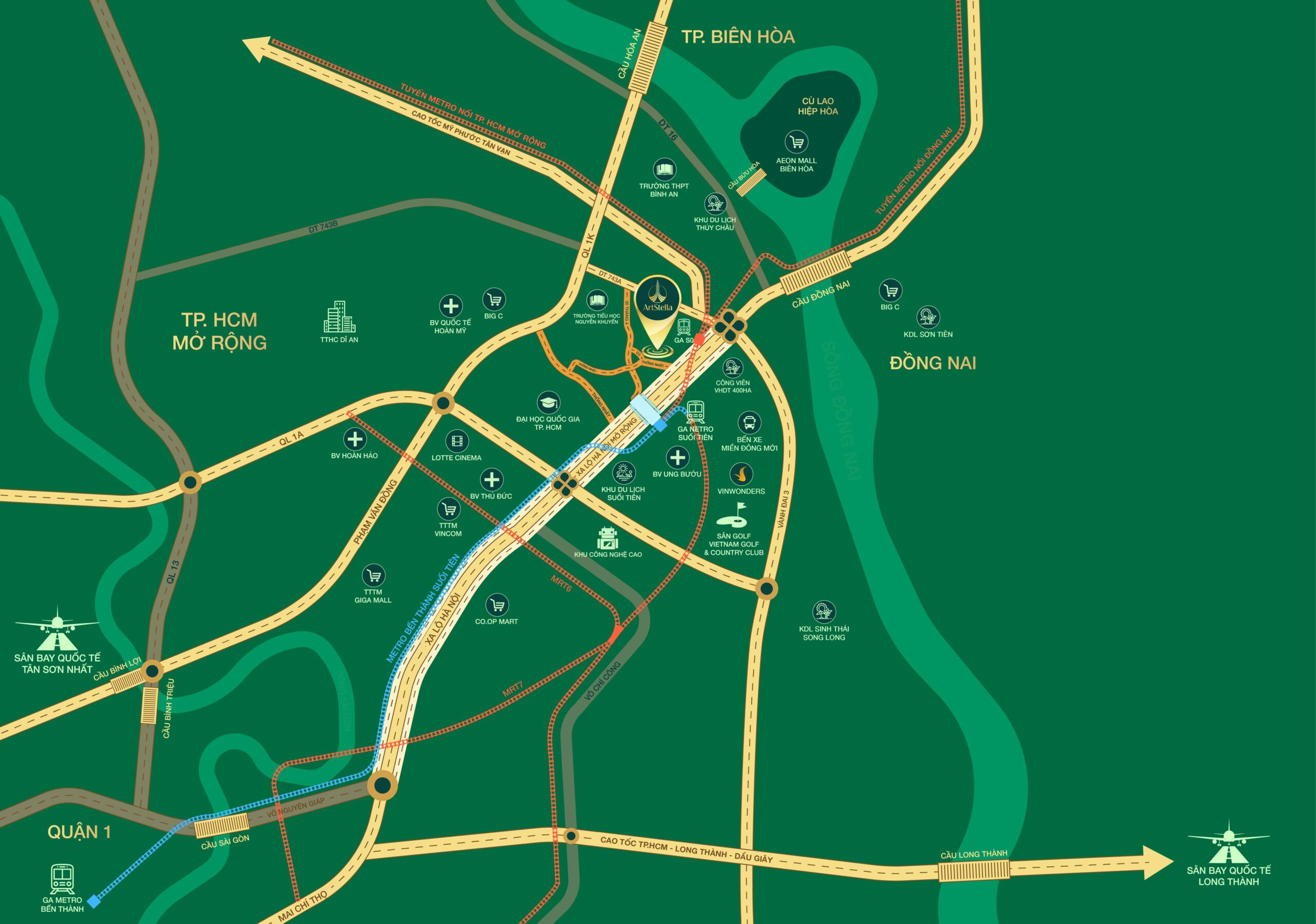 Vị trí Dự án Art Stella tọa lạc ngay mặt tiền đường Thống Nhất, P. Đông Hoà, Thành phố Hồ Chí Minh, thừa hưởng vị trí liền kề tuyến metro số 1- TPHCM và cách Xa lộ Hà Nội – Quốc lộ 1A nối vào TP Thủ Đức chỉ 500m di chuyển. Nơi đây được nhận định là sở hữu vị trí vàng khi nằm gần các trục giao thông huyết mạch gồm Quốc lộ 1A – xa lộ Hà Nội, Mỹ Phước – Tân Vạn – Vành đai 3, Quốc lộ 1K, Bùng binh ngã sáu An Phú,…giúp cư dân dễ dàng kết nối với trung tâm thành phố. Hơn thế nữa căn hộ cao cấp Art Stella nằm liền kề với Khu đô thị Làng đại học Thủ Đức, nơi tập chung nhiều trường đại học lớn nhỏ thu hút hàng nghìn sinh viên, giảng viên đang học tập, làm việc và định cư lâu dài tại đây.